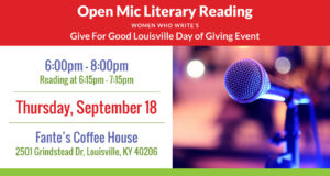 Open Mic Literary Reading Women Who Write’s Give For Good Louisville Day of Giving Event Fante’s Coffee House, 2501 Grinstead Dr. September 18 6:00-8:00 with the reading at 6:15-7:15 Appetizers provided, beverages available for purchase from the coffee house. Members and their guests only. $10 suggested donation. Space is limited. The first 8 people who sign up online to read are guaranteed ... Read More »